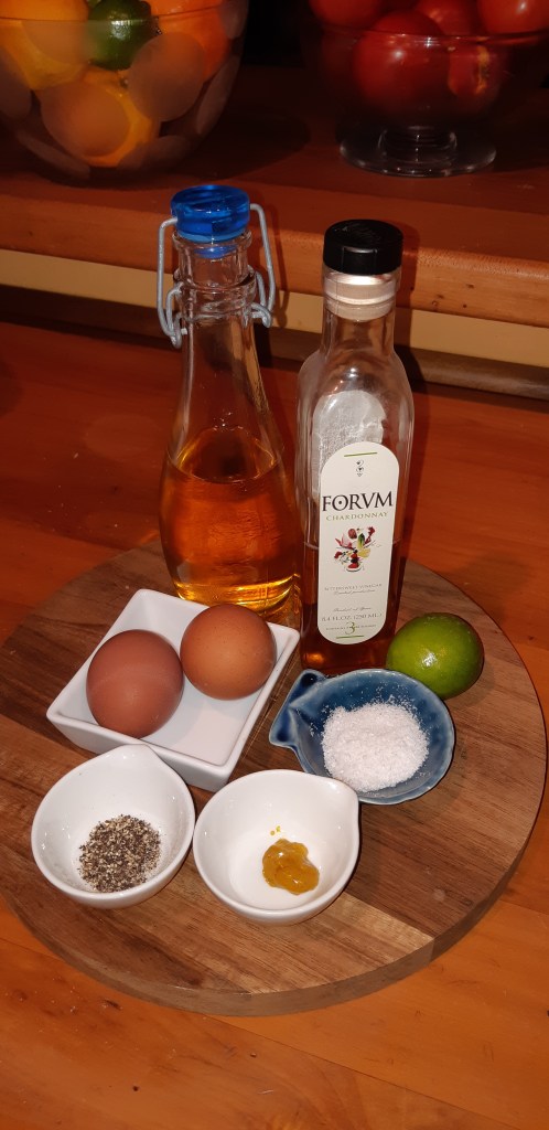 Aioli – add ½ – 1 small clove of garlic smashed really finely to the original yolk/vinegar mix. You may want to ½ and ½ your oil with Olive and Rice Bran.