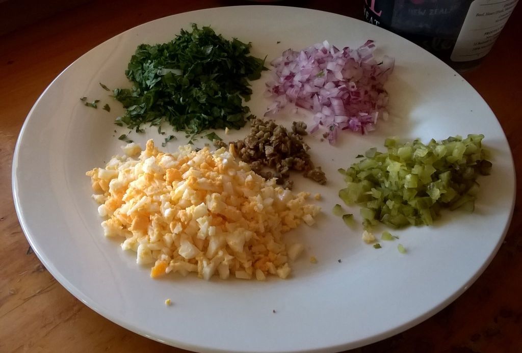 And the good old tartare sauce – it’s really worth making your own. So much nicer than anything in a jar, but it does call on a few pantry ingredients. And I find all the dicing and chopping very therapeutic.