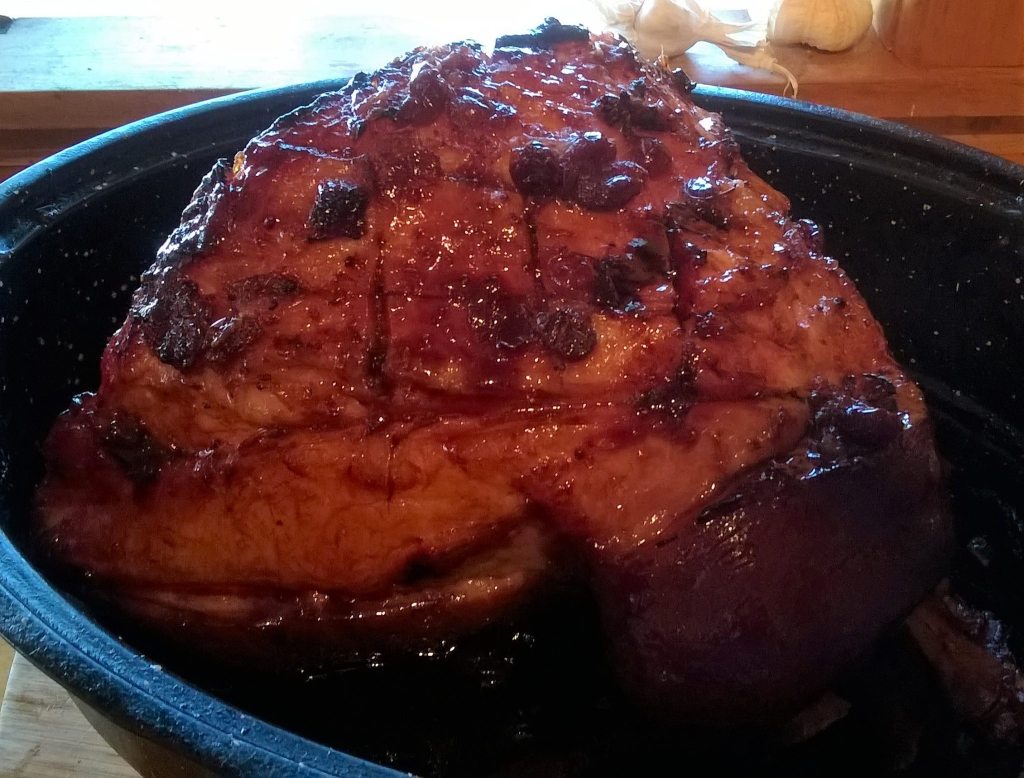 Pour about a 1/3 of the glaze all over the ham and put in the oven. Now comes the basting bit. You’ll be cooking the ham for around an hour and you want to baste it 3-4 times. Easy to do if you’re busy in the kitchen anyway – if not, every ad break go and pull it out of the oven, pour another 1/3 of the glaze on the ham. Once all the glaze has been used, pull the ham out one last time and using a brush brush it all over with the pan juices. Turn the temp up to 180C for the next 10 minutes. By now your kitchen should smell divine, and your ham been dark and sticky looking.