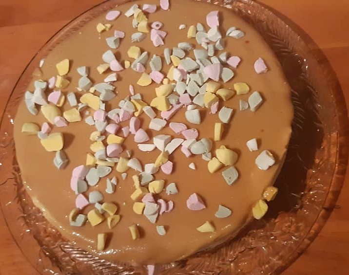 And this year was a cake that ticked many of his flavour profile boxes…. He is a sucker for that Kiwi favourite “Lollycake” – a biscuit and lolly (candy) no bake roll, that you slice and eat… And his favourite dessert is possibly cheesecake…. He will pour caramel sauce over everything, and any brand of Salted Caramel chocolate will win his undying devotion…