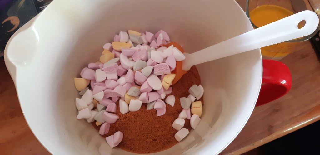 To make the base. Melt the butter, add the condensed milk and stir to combine. Set to one side. Whiz up the biscuits until they are finely ground, mix in the chopped lollies and then pour in the butter/milk mixture. Mix until well combined. It will still look quite dry, but that’s ok.