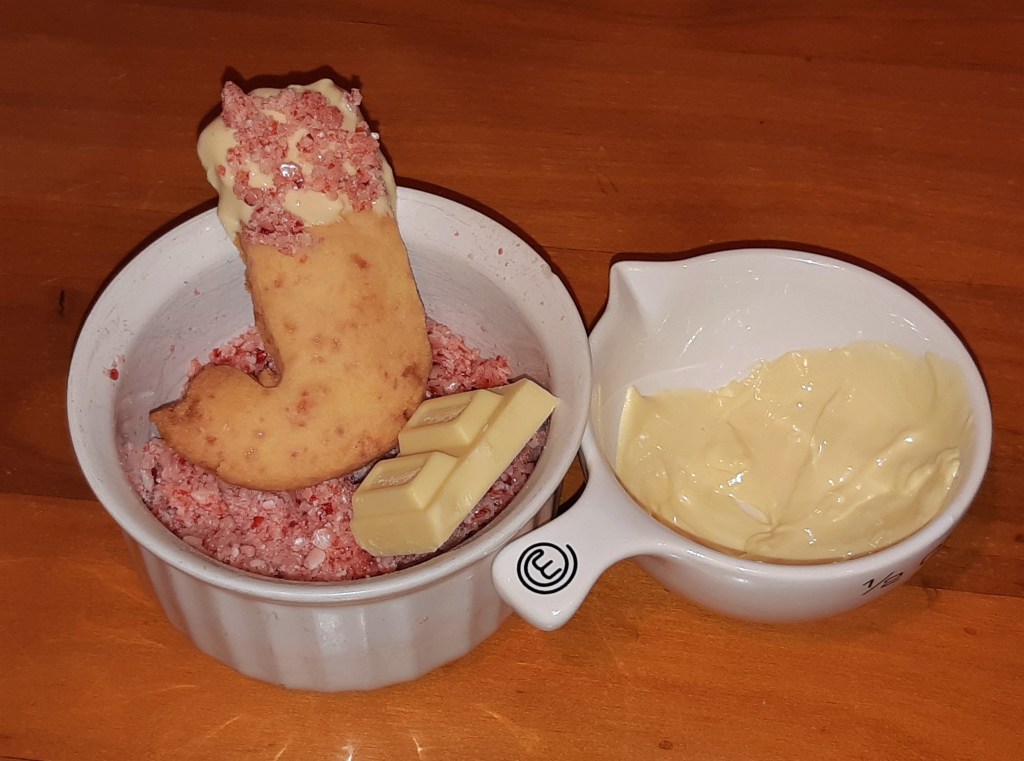 I got the idea for these from an American baking competition. You, of course get the minty candy cane flavour, and the texture of the cookies is slightly chewy. I cut them as stockings and dipped them in melted white chocolate and sprinkled on some more of the crushed candy canes.
