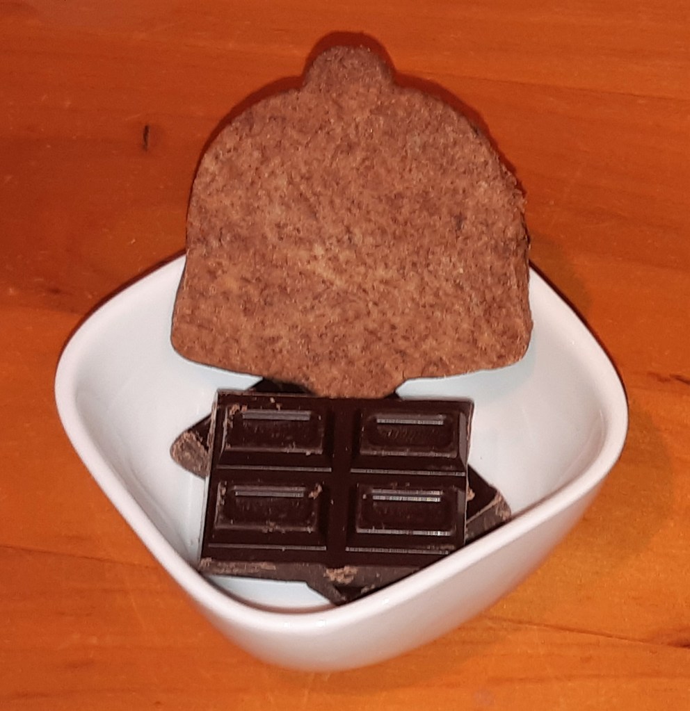 Whiz the dry ingredients together and then add the butter, vanilla and chocolate and proceed as above. Again, it is a slightly shorter cooking time than the plain shortbread – about 8 mins @ 180C.